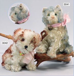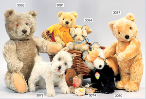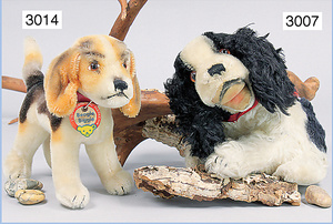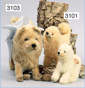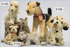 STEIFF Konv. 3 Teile, 1 x Dolly, Dalmatiner, mit Brustschild, 10 cm, sitzend, Drehkopf, 1 x Schnauzer, mit Knopf und Fahne, Nr. 1526/11, sitzend, 11 cm, 1 x Tessie, mit Knopf, Schild und Reste der gelben Fahne, stehend, 7 cm, schöne