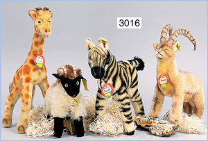 STEIFF Konv. 4 Teile, 1 Giraffe, komplett, Nr. 6328,00, 30 cm Stehhöhe, unbespielt, 1 Zebra, mit Knopf, Schild u. Fahne, Nr. 6322,00, 21 cm, 1 Rocky, Rehbock, Nr. 1322,00, 23 cm, 1 Snucki, komplett, Nr. 1317,00, 16 cm, sehr schönes Konv., alles unbespielt
