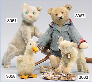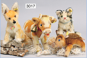 STEIFF Konv. 4 Teile, 1 Katze, mit Knopf u. Fahne, Nr. leider unleserlich, Drehkopf, 13 cm, gestrommelt, 1 Kuh, mit Knopf u. Fahne, Brustschild Bessy, Nr. 1317,03, 16 cm, 1 Fuchs, Xorry, komplett, Nr. 3317,00, 16 cm, Ferkel, komplett, Nr. 1310,03, alle 4 Teile in sehr gutem Zust., unbespielt