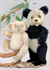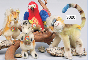STEIFF 4 Teile, 1 Affe, Mungo, mit Knopf, Schild u. Fahne, Nr. 1317,07, 15 cm, Biegeschwanz, unbespielt, 1 Papagei, Lora, mit Knopf, Nr. 1312,08, unbespielt, 12 cm, 1 Känguru, Kangoo, mit Knopf, Schild u. Fahne, Nr. 4314,00, mit Orig.-Baby, 14 cm, 1 Possy, Eichhörnchen, mit Knopf, Schild u. Fahne, Nr. 4314,01, alle 4 Teile in einem absolut unbespielten Zust.
