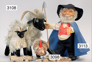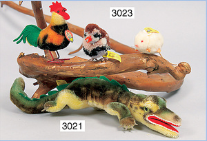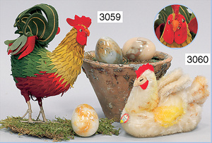 STEIFF Konv. 3 Teile, 1 Wolly-Maus, mit Knopf u. Fahne, Nr. 2504,44, 1 Wolly-Piepmatz, mit Knopf u. Fahne, Nr. 6508,45, Plastikbeine, 1 Hahn, 9 cm, auf Blechbeinen, mit Knopf, Schild u. Fahne, Nr. 1310,07, schönes Konv.