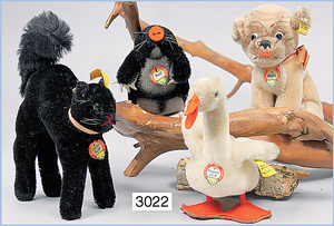 STEIFF Konv. 4 Teile, 1 schwarzer Kater, mit Knopf, Schild u. Fahne, Nr. 7314,00, 18 cm, 1 Mops, Mopsy, mit Knopf, Schild u. Fahne, Nr. 3312,00, mit Drehkopf, 13 cm, 1 Maulwurf, Maxi, mit Brustschild, 11 cm, guter Zust., 1 Gans, mit Knopf, Schild u. Fahne, Nr. 6317,00, 14 cm, guter Zust.