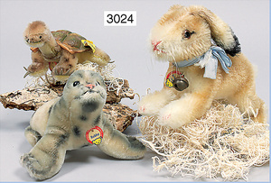 STEIFF Konv. 3 Teile, 1 Robbe, Robby, mit Knopf, Schild u. Fahne, Nr. unleserlich, 10 cm, 1 Hase, mit Knopf, Schild u. Fahne, Nr. unleserlich, rennend, 17 cm lang, 1 Schildkröte, Slow, mit Knopf, Schild u. Fahne, Nr. 2310,00