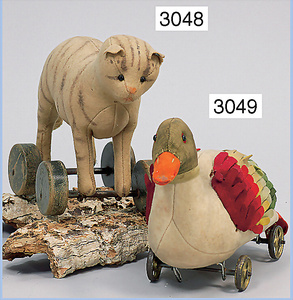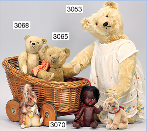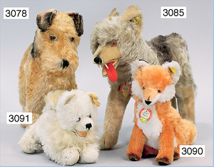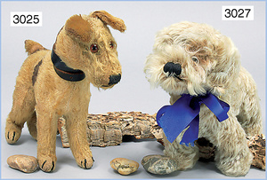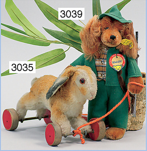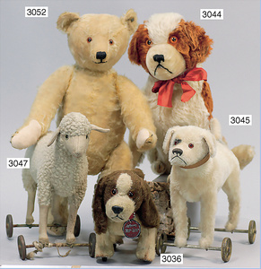 STEIFF Hund, ca. 1910, mit Knopf und weißer Fahne, Nr. 1328, Orig.-Halsband, 28 cm hoch, Gussspeichenräder, bis auf min. Stellen Mohair guter Zust., sehr schöner Ausdruck, selten