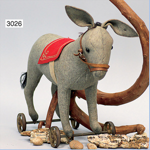 STEIFF Esel, ca. 1930, mit Knopf, min. Reste der roten Fahne, 22 cm hoch, stehend, blau/graues Mohair, Orig.-Sattelgespann, guter Zust.