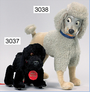 STEIFF Werbefigur, Pudel, Mohair, für Walther Waffenfabrik, 50er Jahre, Vinylgesicht, mit Knopf, 25 cm, altersbed. Vinyl etwas verformt, Mohair gut