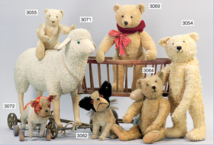 STEIFF Schaf, ca. 1910, 58 cm, Wollplüsch, Filzgesicht, Füße und Ohren, Gussspeichenräder, Zugstimme intakt, mit Knopf, guter bis sehr guter Zust., kl. Filz- und Mohairschäden