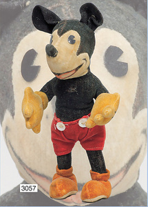 STEIFF Mickey Mouse, ca. 1933, mit Knopf, Samt, 18 cm, stehend, aufgeklebte Augen, gelbe Handschuhe, rote Hose, aufgemalter Mund, selten, guter Zust.