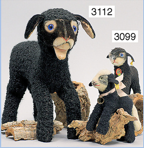 STEIFF Konv. 2 Teile, 1 x Swapel, mit Knopf, Schild und Fahne, 13 cm, stehend, schwarz, 1 x Lamm mit Knopf und Fahne, 14,5 cm, stehend, schwarz