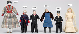 3 Teile Puppenstuben-Puppen, Ganzbiskuit, 5 cm - 9,5 cm, feste Köpfe, bewegl. Arme und Beine, 1 Puppe, 11 cm, Biskuitbrustblatt-Kopf, -Arme und -Beine, Stoffkörper, schöne Orig.-Kleidung