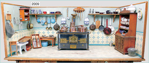 wohl KIBRI herrschaftl. Puppenstuben-Küche, ca. 1890, 1,50 m breit, 63 cm hoch, 76 cm tief, dazu 4 Füße zum Einklappen, möbliert, mit reichhaltigem Zubehör, Porzellan-, Blech-, Messing- u. Keramikteile, herrschaftl. Puppenstuben-Herd, 47 cm hoch, 45,5 cm breit, Löwentatzenfüße, Messingtüren, Topfsatz Kupfer, Kakaokocher mit Quirl, Wasserschiff, 2 Töpfe, 1 Wasserkessel, Deckel vorhanden, schönes museales Stück, auch als Deko zu ca. 40 cm Puppen passend