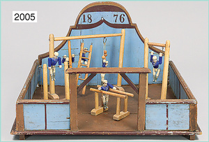 off. Turn- u. Tüchtigungsanstalt, signiert 1876, 38 cm x 31,5 cm x 33 cm, mit Turnern am Reck, Barren, sowie anderen Turngeräten, schöner Orig.-Zust., Figuren aus Holz, mit Masse-Gesichtern