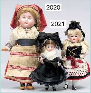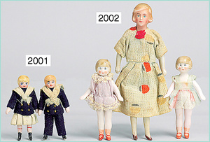 Ganzbiskuit-Puppenstuben-Puppen, 8 cm u. 10,5 cm, fester Kopf, braune fest eingesetzte Glasaugen, Mohairperücke, bewegl. Arme u. Beine, alte Kleidung