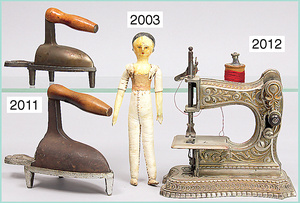 Zeitungshalter, vor 1900, Pappe geprägt, 7,5 cm, mit Orig.-Puppenzeitung und Kalender, für 1894, 1 Bürstenhalter, 1 Bürste fehlt, 8 cm, Stoff, schönes Konv.