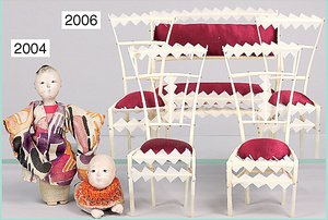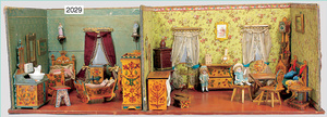 2-teilige Puppenstube, Schlaf- u. Wohnzimmer, aus gleichem Haushalt wie 2028, 91 cm breit, 32 cm hoch, 40 cm tief, Orig.-Tapeten an den Wänden, Durchgangstür mit Spruch am Schlafzimmer "Vor dem Schlafen soll man Beten und nachher kein Wort mehr reden", auf der Seite zum Wohnzimmer "Wenn die Kinder artig sind, kehrt zu ihnen das christliche Kind", möbliert, mit kunstvoll gearbeiteter Brandmalerei, Schlafzimmermöbel, Wohnzimmermöbel, auf dem Tisch eingraviert die Namen der Kinder Elisabeth u. Sophie, einige Teile Zubehör, 2 Ganzbiskuit-Puppen, sehr schöner Orig.-Zust., ausgefallen
