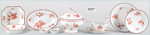 Kinder-Speiseservice, Porzellan, rotes Dekor, Suppenschüssel, Sauciere, 9 Essteller, 12 cm Durchm., 5 Suppenteller, Salz u. Pfeffer, 6 Schalen, schönes Dekor