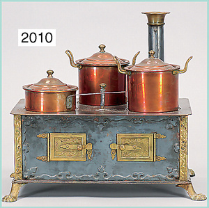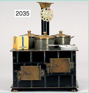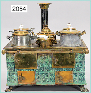Puppenküchen-Herd, ca. 1890, 30 cm breit, 31 cm hoch, Löwentatzenfüße, Messing-Türen mit Griffstange, auflithogr. Kachelmuster, 4 Töpfe, Wasserkessel, Schornstein, Töpfe größenmäßig passend, jedoch nicht alle Orig. zum Herd zugehörig