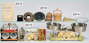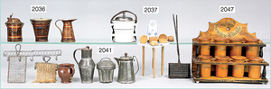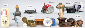 Konv. Puppenküchen-Ausschmückungsteile, Wandregal, Blech, 11,5 cm, kl. Kaffeekocher, Messing, einige Blechteile, Keramikteile (Dachbodenfund aus gleichem Haushalt wie 2009)