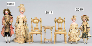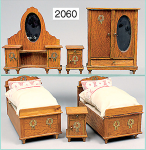 Puppenstuben-Schlafzimmerprogramm, Kleiderschrank, 15,5 cm, Spiegelkommode, 2 Betten, 2 Nachtschränkchen, mit aufgesetzten Jugendstilverzierungen aus Zinn, gold