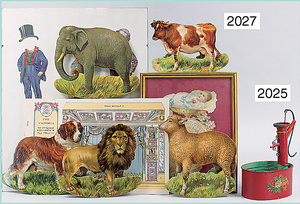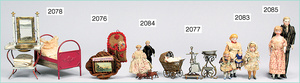 Ankleidepuppe, 22,5 cm, mit 3 Teilen Kleidung, 5 Aufstellfiguren, 25 cm, Bernhardiner, hintere Beine lose, in Oblatenbild gerahmt, "Was unser Kind wiegt", Tellerwaage mit Baby, 26 cm, 1 Pollock´s Theater, Nachdruck 70er Jahre