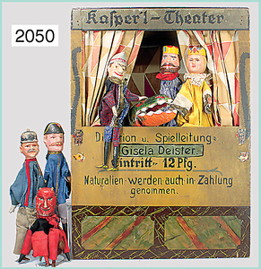 Konv. Kasper´l-Puppen, 6 Figuren, Kasper, Teufel, König und Königin, Soldat, Schutzmann, Holz lackiert, dazu 1 Krokodil, 1920, dazu Gehäuse, bemalt, bedruckte Vorhänge, "Direktion u. Spielleitung", Gisela Deister, Eintritt 12 Pfg., Naturalien werden auch in Zahlung genommen, 70,5 cm x 50,5 cm x 29,50 cm