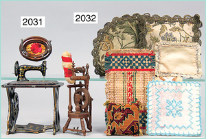 Puppenstuben-Nähmaschine, Holz, 11 cm, Holz am Tritt gebrochen, Spinnrad, 16,5 cm, 1 Garderobenhalter mit gesticktem Bild