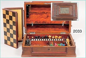 kl. Holztruhe, mit Spielesammlung, Schach, Dame, Mühle, Schachfiguren komplett, sonst auf Vollständigkeit nicht geprüft, kleinere Fehler am Verschluss, ein paar Holzleisten fehlen seitlich, mit eingearbeiteter Messing-Reliefornamentik, seitl. Griffe, 34,5 cm breit, 13,5 cm hoch, 22 cm tief
