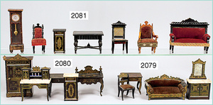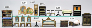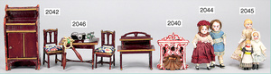GOTTSCHALK Möbelprogramm, dunkelrot/gold, Presspappe, Schrank, Höhe 11,5 cm, Bank, Breite 10,5 cm, Füße weggebrochen, 3 Stühle, Sessel, 1 Bein weggebrochen, Tisch, Schreibtisch, einige Farbabplatzer