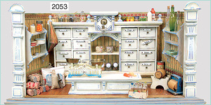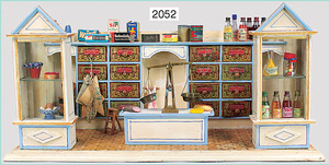 GOTTSCHALK Puppenstube, 71 cm breit, 36 cm hoch, 28 cm tief, verzierte Frontleisten, Schubladen mit Porzellan-Schildern, Orig.-Theke, teilw. farblich überarbeitet, alte Tapete an Wand u. Boden, Zubehör teils alt, teils neuer