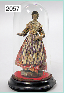 BIEDERMEIER kl. Puppe, Wachs, Papiermaché, Holzkörper, mit Muschelkleid, 14 cm, unter Glassturz