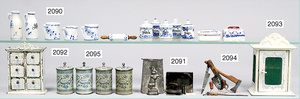 Konv. Puppenküchenteile, ca. 24 Teile, Bank, Blech handlackiert, "Ordnung ist des Kindes Zierde", Länge 11 cm, Krug mit Zinndeckel, 7 cm, Blechteile, Keramikteile, Wasserkessel, lithogr. Blechregal, Breite 11 cm