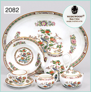 Wedgwood bone China, Made in England, gestempelt, 1 Kaffeekanne mit Teller, Zuckerdose, Milchkännchen, Tasse mit Untertasse, auf Servierplatte, mit asiatischem Motiv und Goldrand verziert