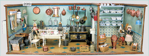 wohl KIBRI Puppenküche mit Vorratskammer, ca. 1880, 1,08 m breit, 40 cm hoch, 46 cm tief, Orig.-Bemalung an Wand u. Boden, Orig.-Außenbemalung, Durchgang, reichh. Zubehör, Porzellan, blau/weiß, Pfitzaufform, Backformen, Kanne, Kupferteile, Wasserschütte, Teller, passender Herd aus der Zeit, Weißblechteile, Kochkiste ohne Einsätze, Teekocher, Tellerwaage, Wandkaffeemühle, kl. Blechtelefon, Brotschneidemaschine, 2 Puppenstuben-Puppen, Biskuitporzellan-Massestehkörper, Orig.-Kleidung