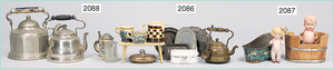 Konv. Zinn, Waschschüssel, mit Halter, 1 Ständer, Schippe, kleiner Kinderwagen, Höhe 7 cm, Zust. 2
