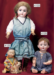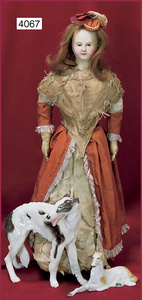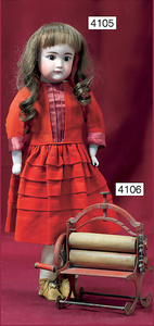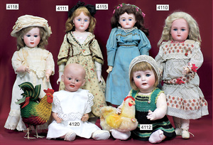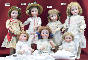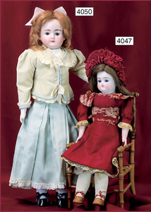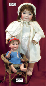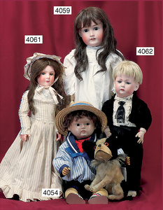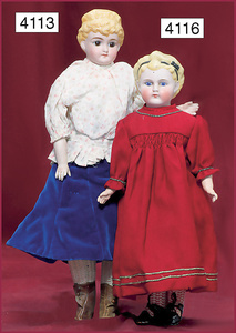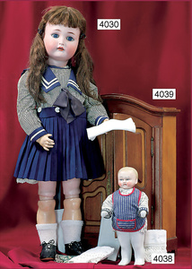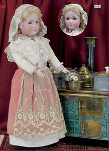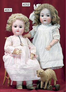 K & R; SIMON & HALBIG Biskuitporzellankopf-Puppe, vorne gekennzeichnet mit W, 75 cm, Kurbelkopf, blaue Schlafaugen, off. Mund, oben Zähne, Kinngrübchen, durchst. Ohren, Gliederkörper, Farbabweichung an den Oberschenkeln, alte Kleidung, alte Schuhe, Echthaarperücke