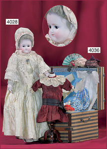 Trousseau-Koffer, für ca. 30 cm Puppe, mit 2 Puppenkleidern, einige Teile Unterwäsche, 2 Seidenschuhe mit Absatz, evtl.. für 1 Modepuppe, Muff-Tasche, 1 Harfe, Bein, 3 Hüte, Seide an den Kleidern teilw. etwas verschlissen, ausgefallen