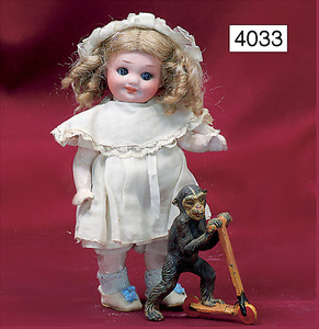 Ganzbiskuit-Puppe, 18,5 cm, fester Kopf, stark ausmodellierte Haare, seitl. blickende gemalte Augen, bewegl. Arme und Beine, aufgemalte Schuhe und Strümpfe, Porzellanabplatzer an einem Bein