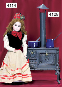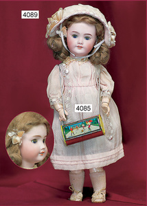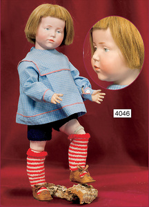 wohl KESTNER Biskuitporzellankopf-Puppe, gemarkt D.E.P. 289, 20 cm, Biskuit-Kurbelkopf, Mohairperücke, blaue Schlafaugen, off. Mund, oben Zähne, Kinngrübchen, ausgeformter Masse-Stehkörper, mit anmodellierten Schuhen u. Strümpfen, Orig.-Gipsdeckel, Orig.-Mohairperücke, Arme von außen unschön befestigt, alte Kleidung