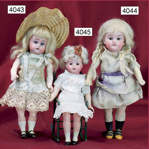 K & R; SIMON & HALBIG 403, 44 cm, Kurbelkopf, blaue Schlafaugen, off. Mund, Zähne u. Zunge, Toddlerkörper, mit hochgezogenen Kniegelenken, an den Oberarmen Farbe abgerieben, Farbabweichung an den Händen, alte Perücke, alte Kleidung u. Schuhe