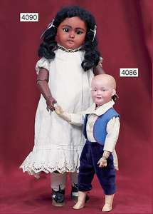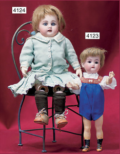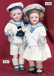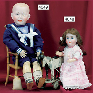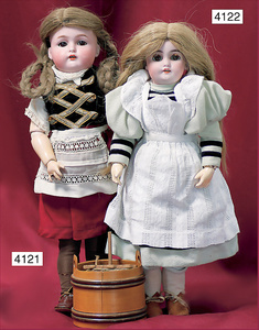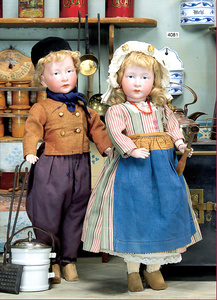 A4M, seltenes Charakter-Puppenpaar, AM, ca. 1910, 40 cm, Junge und Mädchen, Biskuit-Kurbelkopf, blaue Intaglioaugen, weiße Lidpunkte, geschl. Mund, feine Bemalung, schönes Porzellan, Orig. blonde Mohairperücke mit holländischer Orig.-Kleidung, Junge und Mädchen, dazu passende Holzschuhe, absolut selten in diesem nahezu unbespieltem Orig.-Zust.