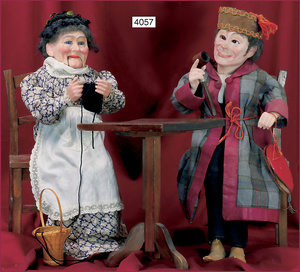 Großvater mit Großmutter, Papiermaché-Puppen, mit Kopfnick-Mechanik, 50 cm Sitzhöhe, schön ausmodellierte Charakterzüge, Großvater mit bewegl. Augen, Großmutter mit bewegl. Unterkiefer, 1 Daumen fehlt, 1 Finger ergänzt, Orig.-Kleidung, Uhrwerke intakt, dekorativ