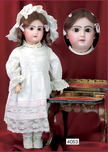 SIMON & HALBIG 1079 Dep. 8, 48 cm, Kurbelkopf, braune Schlafaugen, ( Puppe hat einen leichten Silberblick ), off. Mund, oben Zähne, Kinngrübchen, durchst. Ohren, dunkel eingefärbter Gliederkörper, dunkle Mohairperücke, alte Kleidung Unterkleidung und Schuhe, minimale Abriebstelle auf der Nasenspitze