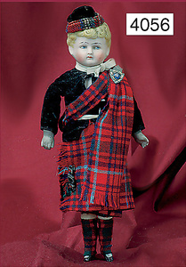 Biskuitporzellan-Brustblattkopf-Puppe, Schotte, 26 cm, fein ausmodellierte blonde Haare, seitl. blickende gemalte Augen, geschl. Mund, Stoffkörper, Biskuit-Arme u. -Beine, alte Kleidung