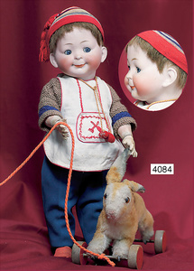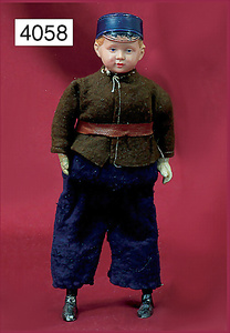 Laufpuppe, mit Uhrwerk, 23,5 cm, Schildkröt-Einbindekopf, Junge, mit anmodelliertem Hut, kl. Druckstelle hinten, Uhrwerk intakt, Filz-Kleidung