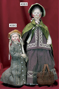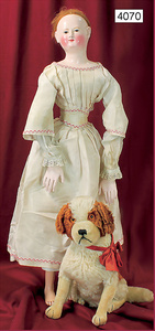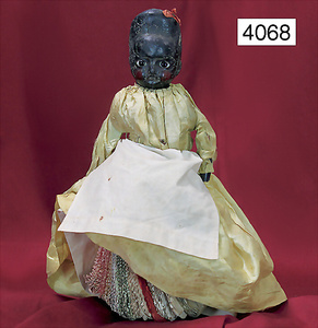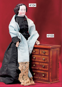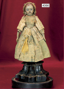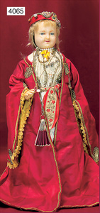 Queen Anne, ca. 1860, 51 cm, Holz-Kopf lackiert, Orig.-Fassung, eingesetzte braune Glasaugen, Holzkörper, Leder-Arme, aufgesetzte Mohairperücke, schöne alte Kleidung, wohl Orig. o. aus alten Stoffen genäht