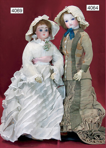 GAULTIER Bébé Frankreich, Nr. 11, 72 cm, gemarkt F. G., in Kartusche, fest eingesetzte große blaue Paperweightaugen, geschl. Mund, Kinngrübchen, durchst. Ohren, sehr helles Biskuit-Porzellan, franz. Gliederkörper, Orig.-Mohairperücke, (etwas ausgegangen), aufwendig gearbeitetes Seiden-Satin-Kleid aus der Zeit, altersbed. verschlissen, teilw. mit neuerem Stoff unterlegt, dazu passende Haube aus der Epoche, alte Unterwäsche, Lederstiefel aus der Zeit, Körper teilw. farbl. ausgebessert, sehr schöner Ausdruck