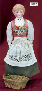 SIMON & HALBIG 1448, seltene Charakterpuppe, Biskuit-Kurbelkopf, Halsmarkierung 1448 S & H, bernsteinfarbene Glasschlafaugen, geschl. Mund, durchst. Ohrlöcher, gold/blonde Mohairperücke zu 2 Zöpfen gebunden, Gliederkörper, aufmodellierter Busen mit Watte und Leinenstoff, 1912, Heinrich Handwerck, sehr schöner nahezu unbespielter Orig.-Zust., Orig.-Trachtenkleidung