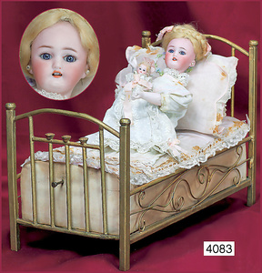 Puppenautomat, Wöchnerin, Mutter mit Kind ( Bett Blech ), 36 cm, Orig.-Bettzeug, Biskuitkopf u. -arme, SIMON & HALBIG, kl. Biskuitkind, blaue Schlafaugen, Musikspielwerk, Puppe stellt sich auf und bewegt die Arme, Orig.-Kleidung