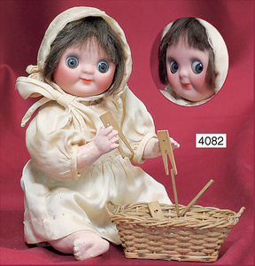 Chipsibaby, J. J. Korsini, Keramik-Kurbelkopf, braune Schelmenaugen, off. Mund, oben Zähne, Zunge, lachend, Stoffkörper, Orig.-Mohairperücke, Orig.-Kleidung, mit Papieranhänger, sehr schöner unberührter Orig.-Zust., 38 cm, kl. Farbfehler am Rand der Perücke sonst unberührter Orig.-Zust.