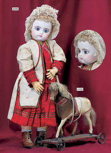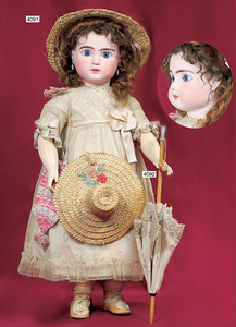 TÊTE JUMEAU Biskuitporzellankopf-Puppe, Frankreich, Gr. 13, 72 cm, Kurbelkopf, braune fest eingesetzte Paperweight-Augen, geschl. Mund, Kinngrübchen, durchst. Ohren, franz. Gliederkörper, Echthaarperücke, Orig.-Korkdeckel, alte Kleidung, ein wenig Ofenstaubeinschlüsse im Porzellan, schöner Ausdruck